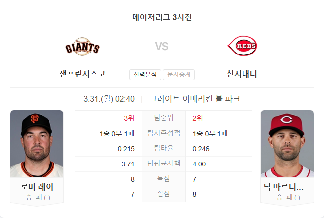 자이언츠는 로비 레이의 안정감 있는 스프링캠프 성적과 경력에서 기대를 걸 수 있으나, 레즈는 홈에서 타선의 집중력이 살아나고 있으며 마르티네즈가 선발과 불펜을 넘나들며 강한 모습을 보여준 바 있습니다. 특히 자이언츠 불펜이 전날 승부처에서 무너졌다는 점을 고려할 때, 신시내티 레즈의 홈 승리가 유력해 보입니다.