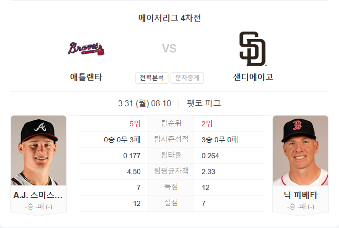 애틀랜타는 젊은 투수 스미스-쇼버에게 많은 기대를 걸고 있지만, 샌디에이고는 개막 시리즈에서 보여준 타선 집중력과 홈 팬들의 열기를 바탕으로 기세가 좋습니다.