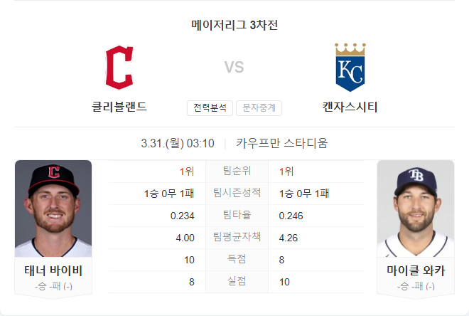 양 팀 모두 개막전에서 장단점을 동시에 드러냈습니다. 가디언스는 비비를 앞세운 안정적인 선발진과 집중력 있는 타선, 특히 만자르도의 활약이 인상적이었고, 로열스는 위트와 파스쿠안티노 중심의 타선이 폭발력을 갖고 있지만 마무리에서 다소 아쉬움이 남았습니다. 선발 매치업은 근소하게 비비 쪽이 우세해 보이며, 가디언스의 연승 가능성이 높아 보입니다.