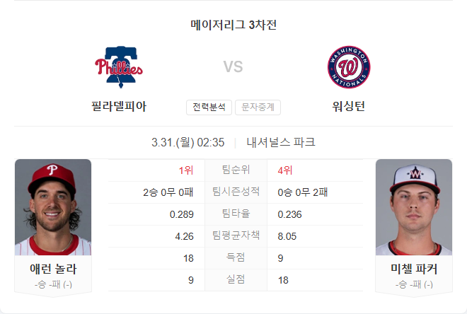 워싱턴은 젊은 유망주 중심의 성장 가능성이 있지만, 파커의 필리스전 부진과 불안정한 마운드 구성은 리스크로 작용합니다. 반면 필리스는 놀라가 마운드를 책임지고, 중심 타선이 꾸준한 득점력을 발휘하고 있어 안정적입니다.