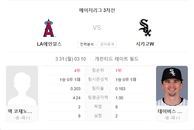타선에서도 에인절스는 솔레르, 트라웃 등 베테랑 중심의 기대감이 더 높은 상황입니다. 투수력과 타선의 기대치 모두 에인절스 우세로 판단됩니다.