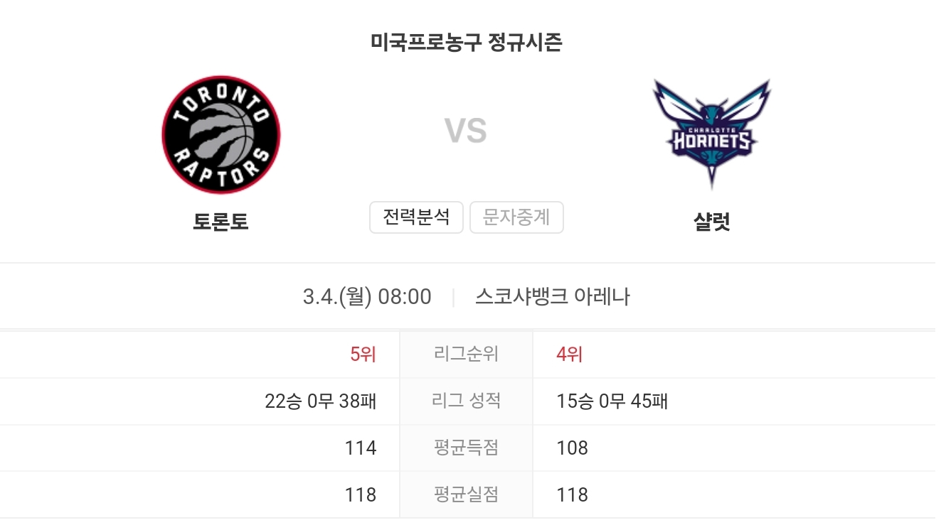 팀의 리더인 브랜든 밀러와 마일스 브릿지스가 앞장서고 있지만, 두 선수만으로는 경기의 흐름을 완전히 바꾸기에는 역부족인 상황입니다. 이번 경기에서 호넷츠는 랩터스의 견고한 수비를 뚫고 점수를 내는 것이 주요 과제가 될 것입니다.