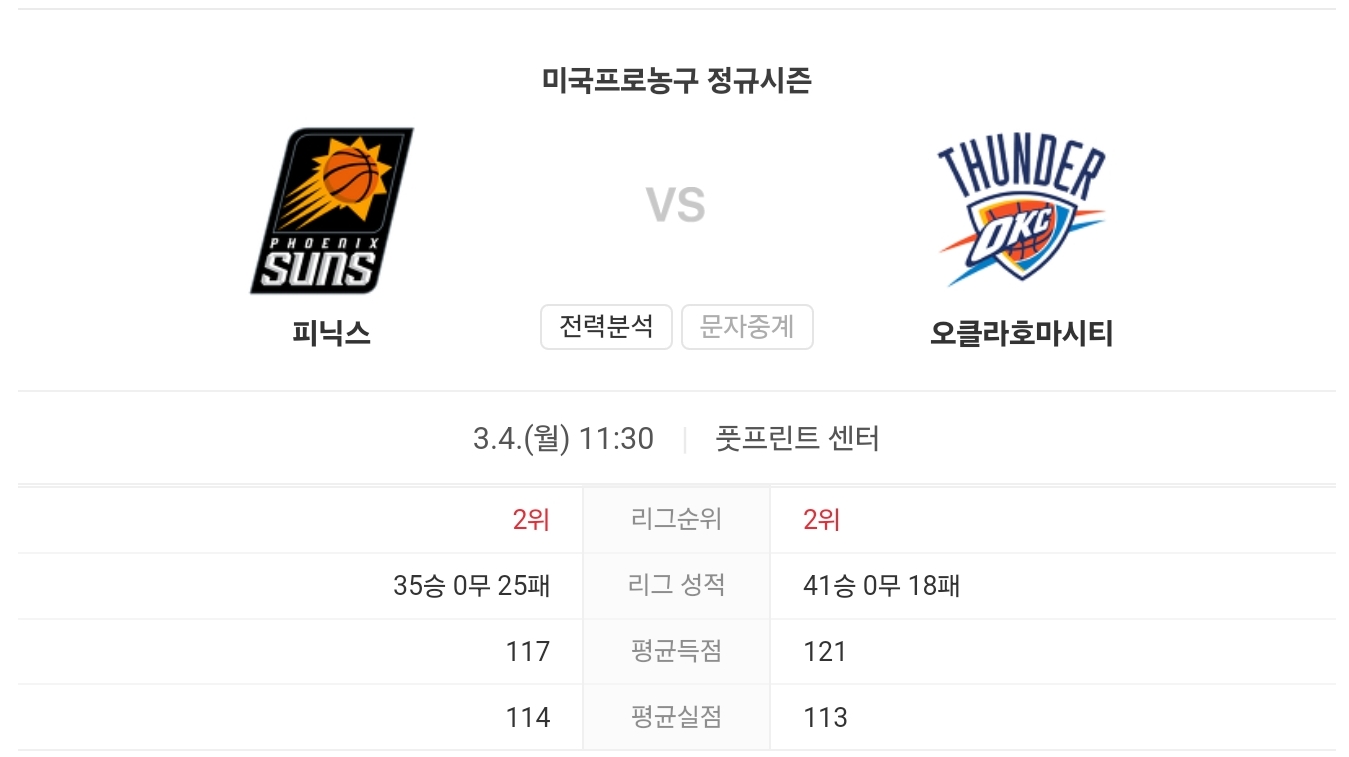 3월 4일 NBA 오클라호마시티 썬더 VS 피닉스 선즈 경기 예측