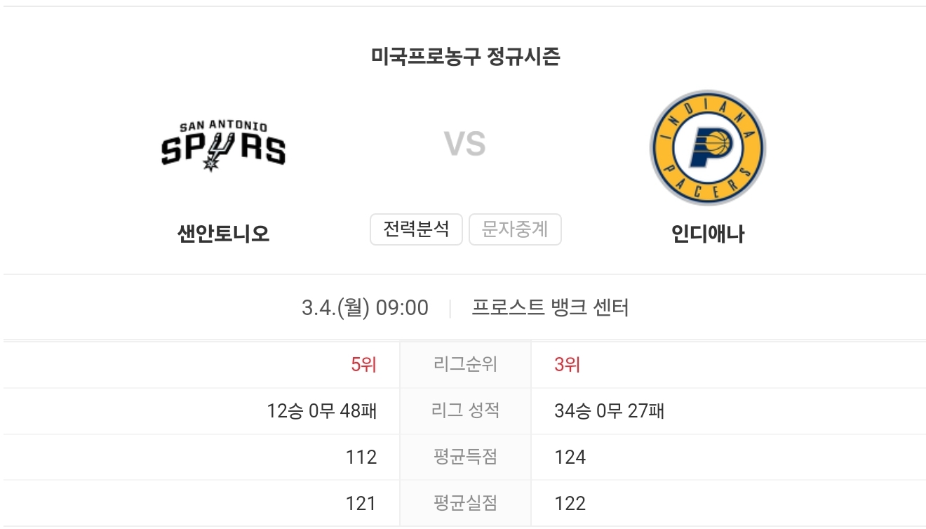3월 4일 NBA 인디애나 페이서스 VS 샌안토니오 스퍼스 경기 예측