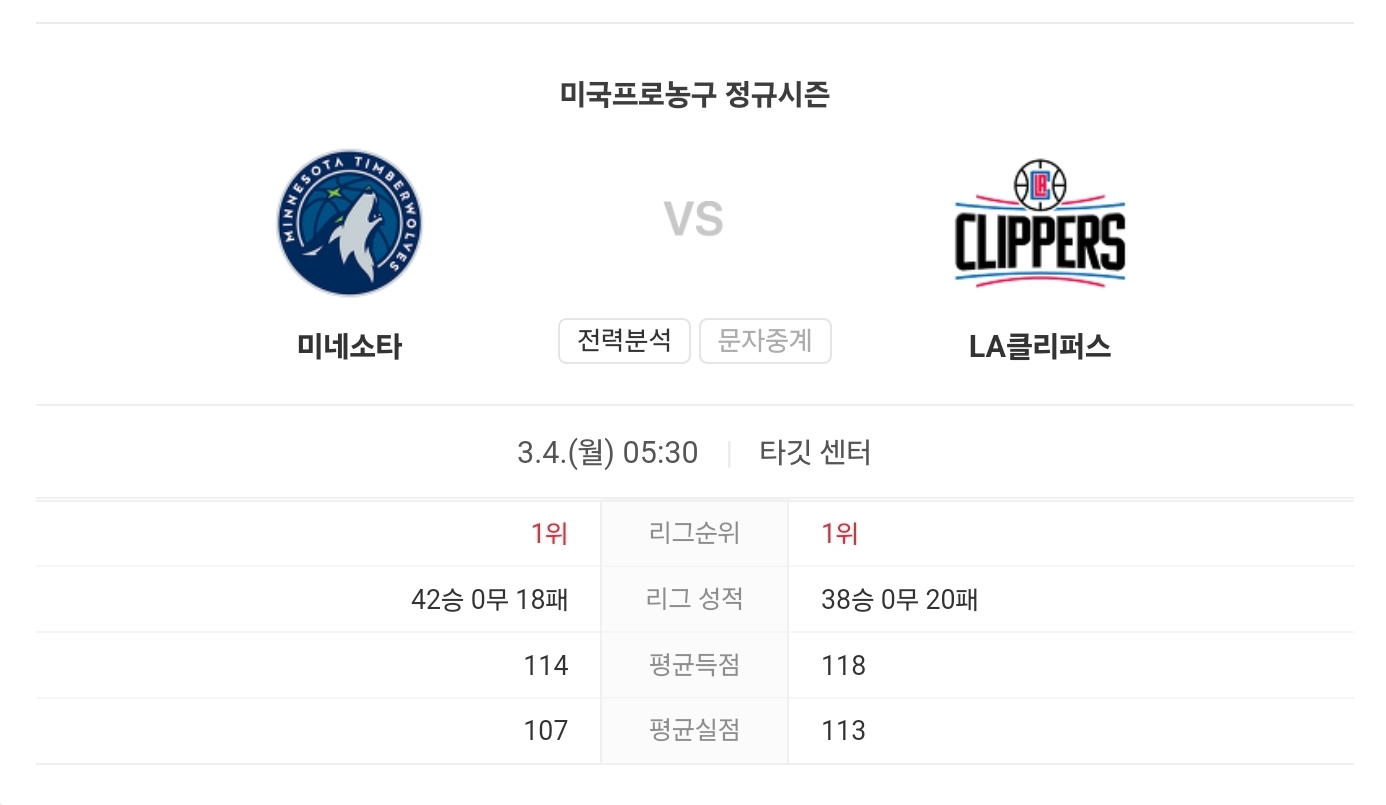 양 팀 모두 최근 좋은 흐름을 이어가고 있으며, 이번 경기는 서부 컨퍼런스 상위권을 노리는 두 팀 간의 치열한 대결이 될 것으로 예상됩니다. LA 클리퍼스의 강력한 공격력과 미네소타 팀버울브스의 탄탄한 수비력이 맞붙게 되는데, 경기의 흐름은 양 팀의 주요 선수들의 컨디션과 그날의 경기 운영에 따라 크게 달라질 것으로 보입니다.