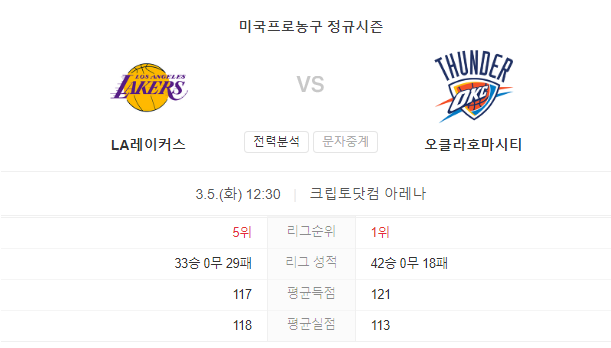 3월 5일 NBA 오클라호마시티 썬더 VS LA 레이커스 경기 예측