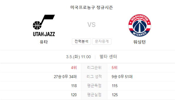 3월 5일 NBA 워싱턴 위저즈 VS 유타 재즈 경기 예측