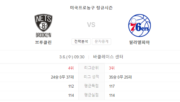 3월 6일 NBA 필라델피아 세븐티식서스 VS 브루클린 네츠 경기 예측
