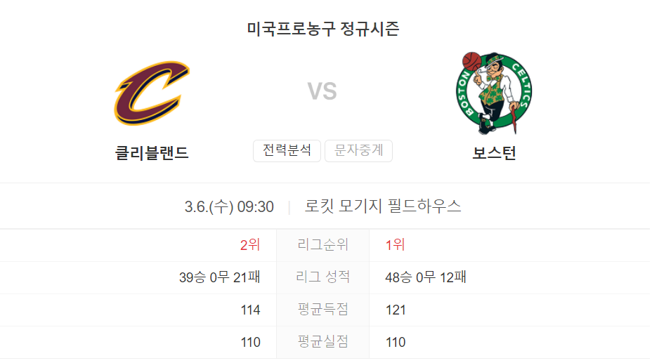 3월 6일 NBA 보스턴 셀틱스 VS 클리블랜드 캐벌리어스 경기 예측