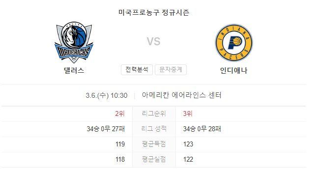 3월 6일 NBA 인디애나 페이서스 VS 달라스 매버릭스 경기 예측