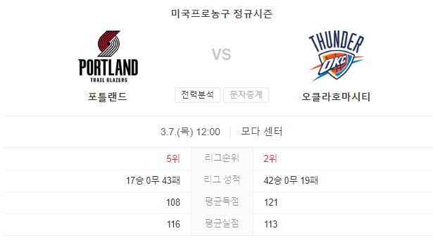 반면, 포틀랜드 트레일블레이저스는 부상으로 인한 선수들의 결장과 전반적인 팀 성적의 부진으로 인해 이번 경기에서 승리하기 어려울 것으로 보입니다. 따라서 오클라호마시티 썬더가 이번 경기에서 우위를 점할 것으로 예상됩니다.