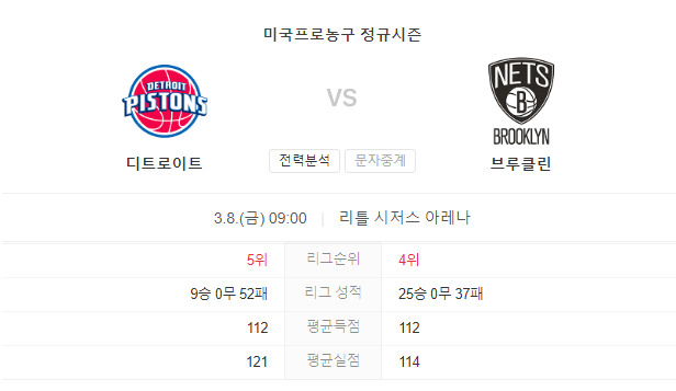 이 경기는 플레이오프 진출을 위해 싸우는 브루클린 네츠와 드래프트에서 좋은 위치를 확보하고자 하는 디트로이트 피스톤즈 간의 대결입니다. 홈팀인 디트로이트는 시즌 내내 많은 경기에서 패배하는 전략을 택할 가능성이 높으며, 방문팀인 브루클린은 승리를 통해 플레이오프 진출 가능성을 높이려 할 것입니다.