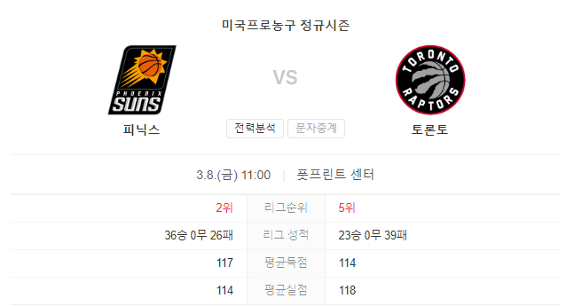 피닉스 선즈와 토론토 랩터스의 이번 경기는 플레이오프 진출을 위한 피닉스의 의지와 토론토의 미래를 위한 전략이 맞붙는 대결입니다. 피닉스는 홈에서 강한 모습을 보여왔으며, 토론토의 3점 방어 약점을 이용해 중요한 승리를 거둘 것으로 예상됩니다.