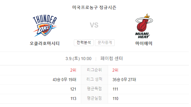 3월 9일 NBA 마이애미 히트 VS 오클라호마시티 썬더 타카짱의 경기 예측!