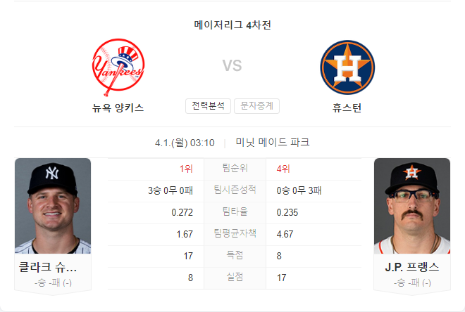 양팀 모두 강력한 라인업을 보유하고 있으며, 특히 양키스의 경우 소토와 저지의 활약이 기대된다. 반면, 애스트로스는 홈에서의 경기력 개선을 통해 시리즈 마지막 경기에서 승리를 가져가려 할 것이다. 전체적으로 치열한 경기가 예상되며, 양팀의 선발 투수와 타선의 퍼포먼스가 승부의 관건이 될 것으로 보인다.