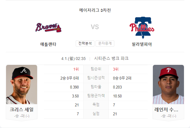 4월 1일 MLB 믈브 애틀란타 브레이브스 VS 필라델피아 필리스 경기 예측