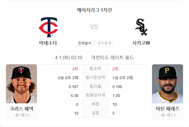트윈스는 3연패로 시작하며 분위기가 가라앉은 상태이며, 원정에서 ERA가 높은 패닥이 등판하는 만큼 불안 요소가 있습니다. 반면 화이트삭스는 비록 시리즈 패배를 당했지만 홈에서 마르틴 페레즈가 비교적 좋은 성적을 거두고 있어 기대할 만합니다. 공격력은 양 팀 모두 아쉬운 흐름이지만, 홈 이점과 선발 투수의 안정감을 고려했을 때 화이트삭스의 우세가 예상됩니다.