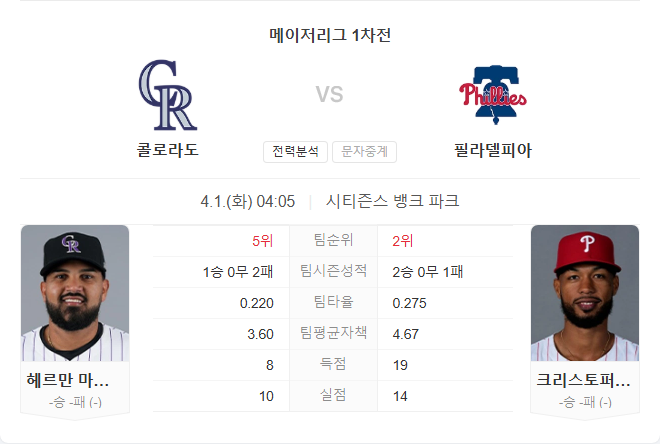 양 팀 모두 타선에 힘이 있지만, 필리스는 슈와버와 하퍼를 중심으로 초반부터 공격적인 운영이 예상되며 홈 경기 이점도 큽니다. 로키스는 마르케스가 긴 공백을 이겨내고 안정된 피칭을 보여줘야 승산이 있지만, 산체스가 홈에서 강세를 보여주고 있고, 타선의 짜임새도 필리스가 우위에 있습니다.