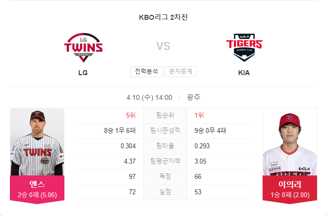 기아 타이거즈는 이의리를 앞세워 연승에 도전합니다. KT 원정에서 5이닝 2실점으로 승리를 거둔 이의리는 이번 홈 경기에서 더 나아진 투구 내용을 보여줄 것으로 기대됩니다.