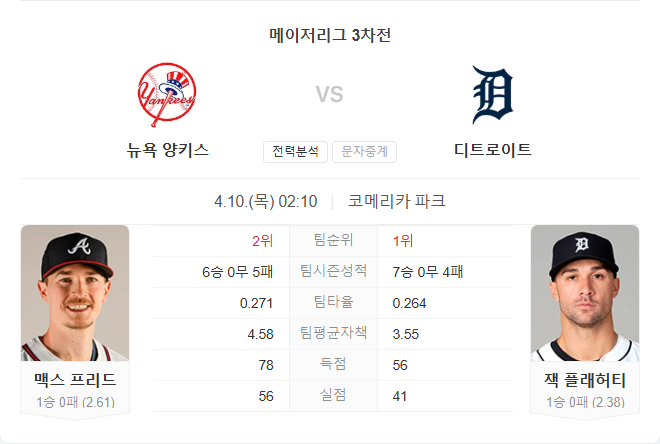 4월 10일 MLB 메이저리그 뉴욕 양키스 VS 디트로이트 타이거즈 타카짱의 경기 예측 분석