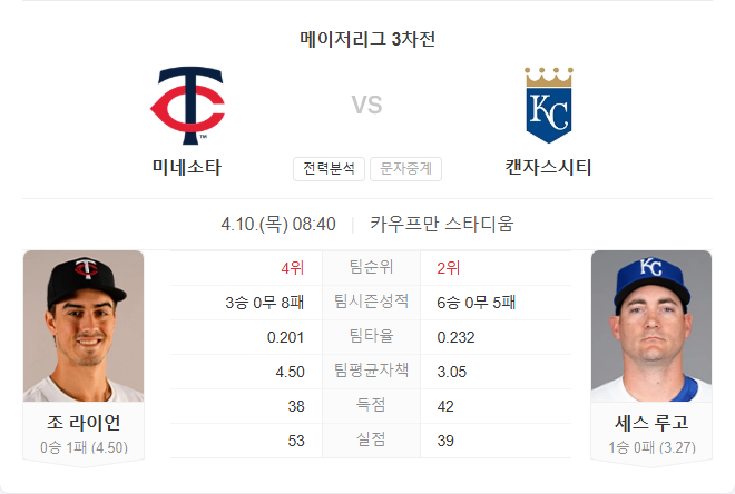 트윈스는 심각한 타격 부진과 부상으로 인해 전력 공백이 크며, 팀 전체 득점력과 마운드 안정성 모두 리그 하위권에 머물러 있습니다. 반면 로열스는 안정적인 선발진과 홈경기의 이점을 갖추고 있으며, 루고의 꾸준한 피칭은 미네소타 타선을 억제하기에 충분해 보입니다.
