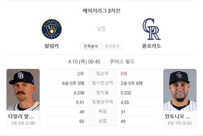 4월 10일 MLB 메이저리그 밀워키 브루어스 VS 콜로라도 로키스 타카짱의 경기 예측 분석