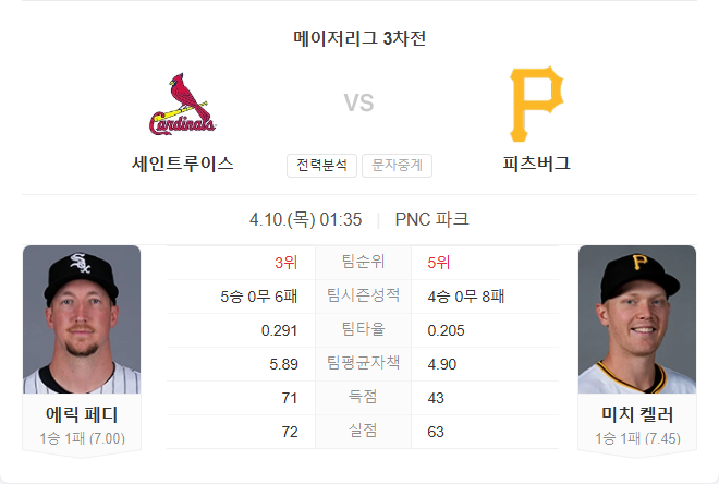 4월 10일 MLB 메이저리그 세인트루이스 카디널스 VS 피츠버그 파이어리츠 타카짱의 경기 예측 분석