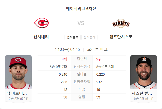4월 10일 MLB 메이저리그 신시내티 레즈 VS 샌프란시스코 자이언츠 타카짱의 경기 예측 분석