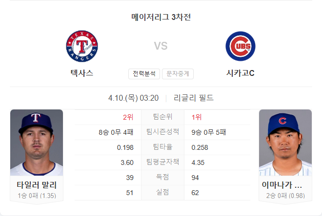 양 팀의 최근 흐름을 감안하면 시카고가 우세한 흐름을 이어가고 있습니다. 특히 이마나가가 홈에서 강한 모습을 보이고 있어, 원정 타격이 부진한 텍사스 타선을 상대로도 호투가 기대됩니다.