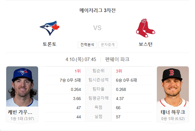 양 팀 모두 안정적인 선발을 내세우지만, 최근 흐름과 경기력 면에서 토론토가 앞서 있습니다. 가우스먼은 WHIP 0.71로 뛰어난 제구를 바탕으로 실점을 최소화하고 있으며, 보스턴의 타선이 전반적으로 침묵하고 있는 현 상황에서 우위를 점할 수 있습니다.