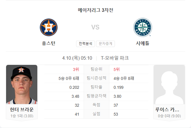 첫 경기에서는 샌프란시스코를 상대로 3이닝 3실점으로 부진했고, 현재 평균자책점 9.00, WHIP 2.667을 기록 중입니다. 카스티요는 애스트로스를 상대로는 첫 등판이며, T-모바일 파크에서도 첫 선발 출전입니다. 팀 타선이 아직 본격적으로 폭발하지는 않았으나, 불펜은 최근 안정적인 흐름을 보이고 있습니다.