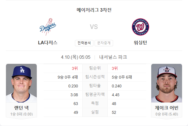 랜던 내크가 비록 시즌 첫 선발이지만 지난해 안정적인 피칭을 기반으로 5이닝 이상 소화할 가능성이 큽니다. 반면 워싱턴은 어빈의 불안정한 피칭과 기복 있는 공격력이 변수입니다. 시리즈에서 앞서가고 있지만 전력 우위는 다저스에 있으며, 반등이 필요한 상황에서 집중력을 발휘할 가능성이 높습니다.