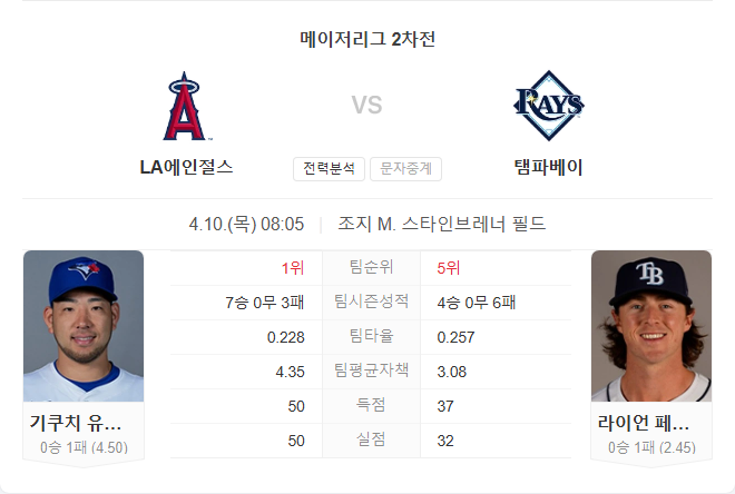 에인절스는 최근 5경기에서 4승 1패를 기록하며 상승세를 타고 있습니다. 클리블랜드와의 시리즈에서 2승을 챙기며 분위기를 끌어올렸고, 타일러 앤더슨의 5이닝 1피안타 호투와 오홉과 솔레어의 홈런이 팀 승리를 이끌었습니다. 이번 경기 선발은 좌완 유세이 키쿠치로, 시즌 2경기에서 0승 1패, 평균자책점 4.50, WHIP 1.17을 기록 중입니다.