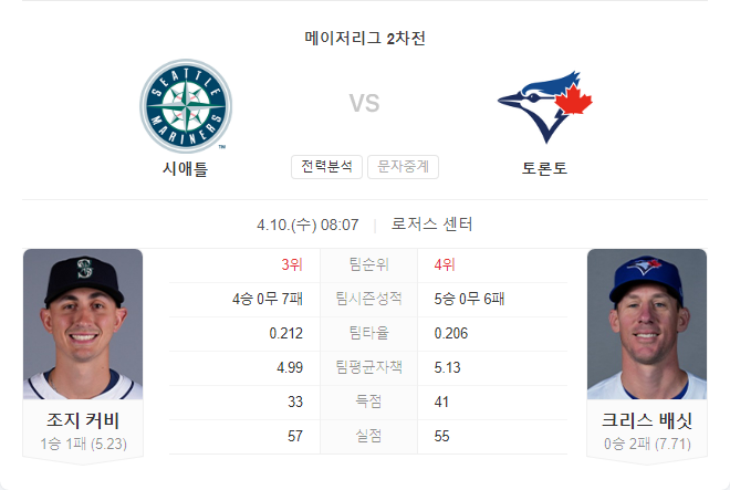 4월 10일 MLB 믈브 애리조나 다이아몬드백스 VS 콜로라도 로키스 타카짱의 경기 예측 분석