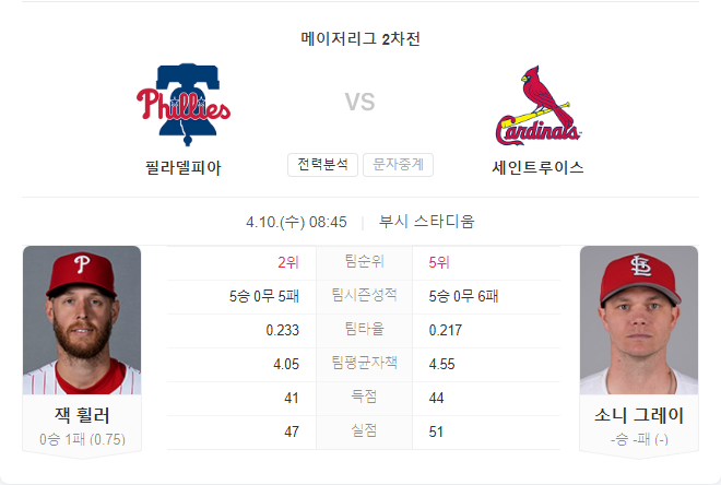 반면, 카디널스는 타선의 부진과 투수진의 불안정이 겹치며 어려움을 겪고 있으며, 소니 그레이의 시즌 첫 등판이 변수로 작용할 수 있습니다. 필라델피아가 좋은 투수력을 바탕으로 경기를 주도하며 승리할 것으로 예상됩니다.