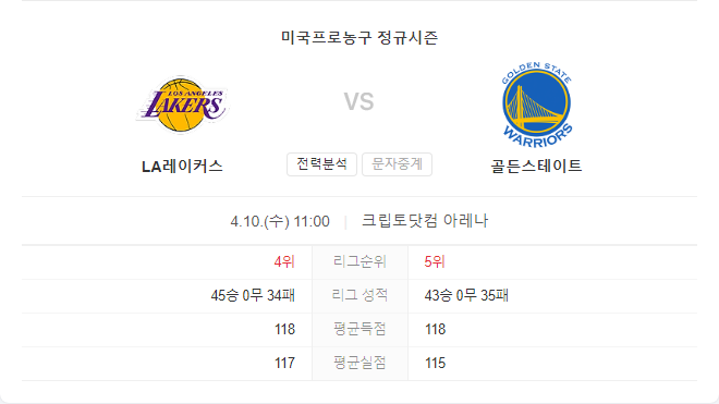 | 4월 10일 NBA LA 클리퍼스 VS 피닉스 선즈 타카짱의 경기 예측 분석 (0) | 2024.04.09 |