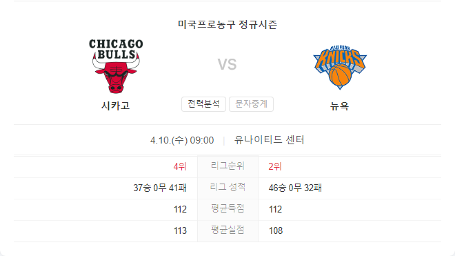 반면, 불스는 최근 경기에서 다소 고전하고 있으며, 주요 선수들의 부상이 팀에 영향을 미치고 있습니다. 홈코트에서 열리는 이번 경기에서 불스가 이점을 가질 수 있지만, 닉스의 최근 경기력과 전력을 고려할 때 닉스가 승리를 가져갈 가능성이 높아 보입니다.