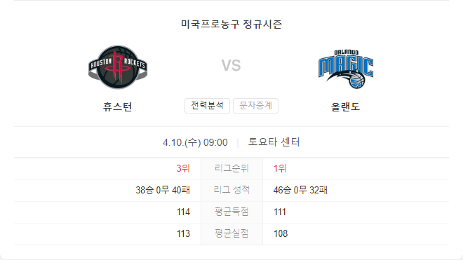 두 팀 모두 주요 선수들의 부상으로 전력에 차질을 겪고 있지만, 올랜도는 최근 10경기에서 상대적으로 더 안정적인 모습을 보여주고 있습니다. 올랜도가 이번 시즌 첫 대결에서 대승을 거둔 것을 고려할 때, 이번 경기에서도 올랜도가 우세할 가능성이 높아 보입니다. 하지만 휴스턴의 홈 이점과 리바운드에서의 강점도 무시할 수 없으므로 치열한 경기가 예상됩니다.
