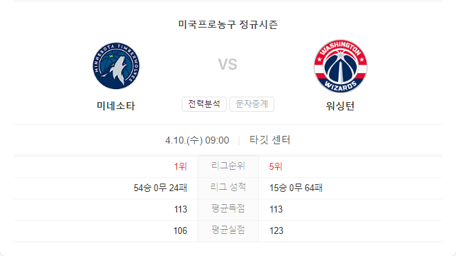 워싱턴 위저즈는 이번 시즌 많은 어려움을 겪으며 최하위권에 머물고 있으며, 주요 선수들의 부상으로 인해 경기력이 더욱 약화되었습니다. 반면, 미네소타 팀버울브스는 서부 컨퍼런스 1위를 달리며 강력한 모습을 보이고 있으며, 특히 홈에서의 강점을 바탕으로 이번 경기에서도 우위를 점할 것으로 예상됩니다.
