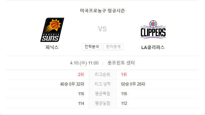 이 경기는 피닉스 선즈에게 매우 중요합니다. 플레이인 토너먼트를 피하기 위해 상위 6위 안에 드는 것이 그들의 목표이며, 남은 네 경기를 모두 이긴다면 확실히 달성할 수 있습니다. LA 클리퍼스를 상대로 경기 내내 템포를 조절하는 것이 중요할 것입니다.