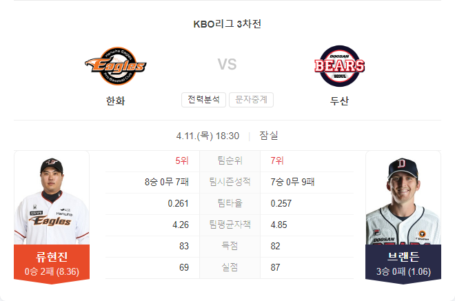 두 팀의 마지막 경기에서 두산은 선발 경쟁에서 우위를 점하며 승리를 가져갔습니다. 류현진이 이번 경기에서 강한 의지를 보이고 있지만, 두산 타선이 공격적인 모습을 보여줄 가능성이 높습니다.
