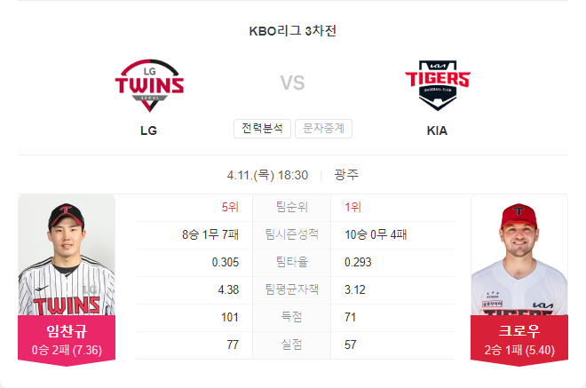LG 트윈스는 임찬규를 선발로 내세웁니다. 임찬규는 시즌 초반 두 번의 등판에서 제구 문제와 장타를 허용하는 문제로 고전했습니다.