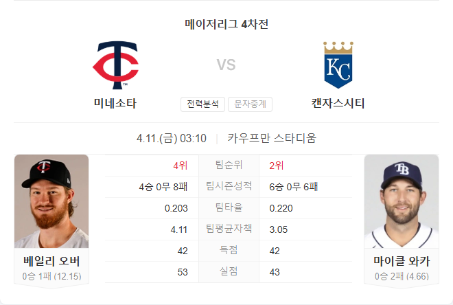 트윈스는 최근 타선 침묵과 불안한 선발진으로 고전하고 있으며, 오버가 반등의 조짐을 보였지만 아직 이닝 소화력이 부족합니다. 반면 로열스는 홈에서 연승 흐름을 타고 있으며, 와카의 홈 강세와 팀 타선의 짜임새 있는 경기 운영이 안정적입니다. 미네소타가 원정 약세를 극복하기는 쉽지 않아 보이며, 시리즈 마지막 경기도 캔자스시티가 가져갈 가능성이 높아 보입니다.
