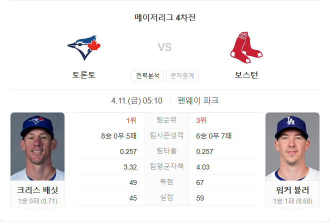보스턴은 홈 개막 시리즈에서 세인트루이스를 상대로 스윕을 거두며 좋은 출발을 보였지만, 이후 텍사스에게 시리즈를 내주는 등 경기력의 기복이 존재합니다. 현재 6승 6패로 지구 중위권에 머무르고 있으며, 이번 시리즈에서 연패를 당해 분위기 반전이 절실합니다. 선발은 와커 뷸러로, 직전 세인트루이스전에서 5이닝 7피안타 5실점(홈런 2개)으로 부진한 모습을 보였습니다.