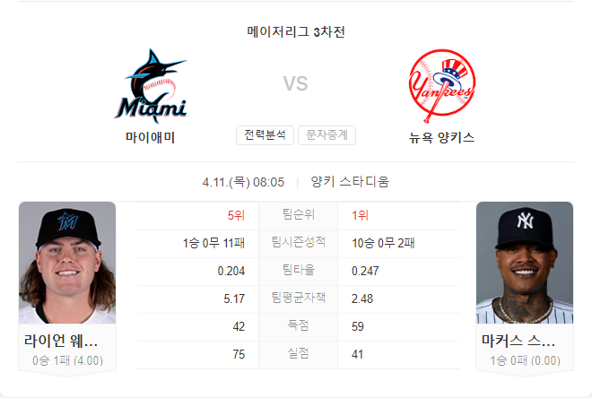 마이애미 말린스는 시즌 초반 어려움을 겪고 있으며, 현재 1승 10패의 부진한 성적을 기록 중입니다. 지난 세인트루이스 카디널스와의 경기에서 시즌 첫 승리를 거두며 연패에서 벗어났지만, 이어진 뉴욕 양키스와의 경기에서는 투수진이 무너지며 패배했습니다.