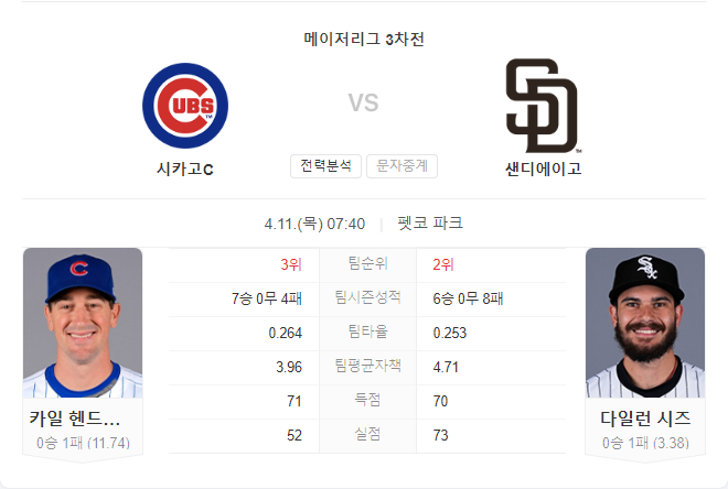4월 11일 MLB 믈브 시카고 컵스 VS 샌디에이고 파드리스 타카짱의 경기 예측 분석