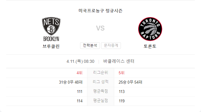 4월 11일 NBA 토론토 랩터스 VS 브루클린 네츠 타카짱의 경기 예측 분석