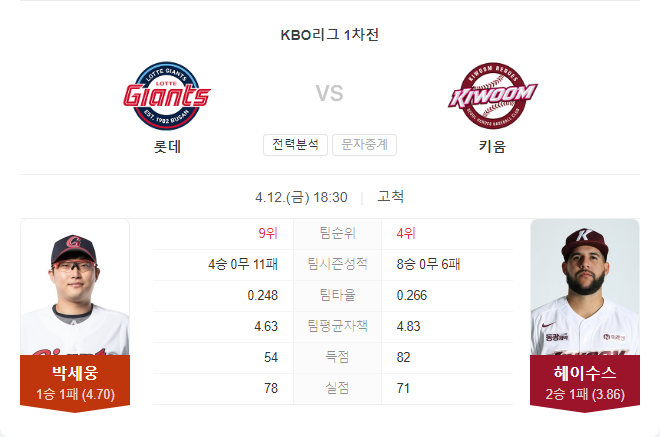 | 4월 11일 KBO 프로야구 키움 히어로즈 VS SSG 랜더스 타카짱의 경기 예측 분석 (0) | 2024.04.11 |
