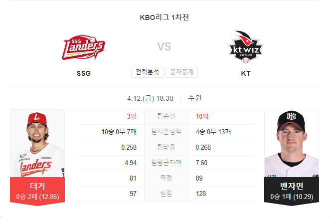 4월 12일 KBO 프로야구 SSG 랜더스 VS KT 위즈 타카짱의 경기 예측 분석