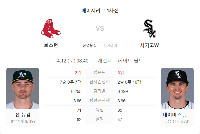 반면 시카고는 마틴의 극심한 부진과 타선의 침묵, 잇따른 부상으로 인해 반전 동력이 부족한 상황입니다. 원정임에도 불구하고 보스턴이 경기 초반부터 주도권을 잡고 무난하게 승리할 가능성이 높습니다.